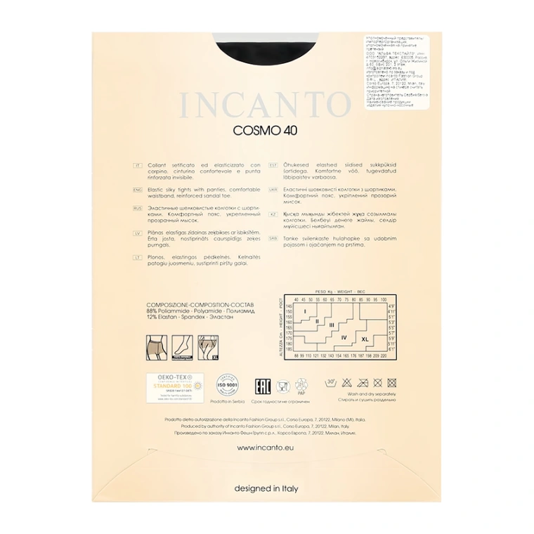 Ассортимент марки сегодня весьма обширен и включает в себя: классические и фантазийные колготки, изящные чулки, теплые и комфортные зимние модели, прочные носки и гольфы. Большой выбор цветов и размеров неизменно привлекает самый широкий круг поклонниц марки и по праву делает бренд INCANTO одним из самых популярных в Восточной Европе.
