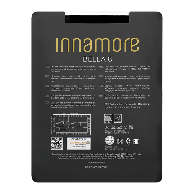 INNAMORE – бренд для влюбленных в моду! Дизайнеры марки создают модели для ярких, открытых всему новому, молодых женщин, которые не боятся fashion-экспериментов, умеют смешивать стили и тренды, стремятся выглядеть остромодно, при этом, не потеряв собственной индивидуальности. Бренд появился в начале 2000-х годов в Италии и сегодня входит в группу компаний INCANTO FASHION GROUP. Продукция сочетает в себе новейшие тенденции с подиумов, итальянское чувство стиля, европейское качество - и все это по демократичным ценам. Ассортимент марки сегодня весьма обширен и включает в себя: классические и фантазийные колготки, изящные чулки, теплые и комфортные зимние модели, прочные носки и гольфы. Большой выбор цветов и размеров неизменно привлекает самый широкий круг поклонниц марки и по праву делает бренд INNAMORE одним из самых популярных в Восточной Европе.