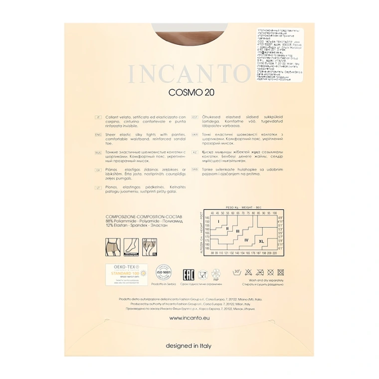 Ассортимент марки сегодня весьма обширен и включает в себя: классические и фантазийные колготки, изящные чулки, теплые и комфортные зимние модели, прочные носки и гольфы. Большой выбор цветов и размеров неизменно привлекает самый широкий круг поклонниц марки и по праву делает бренд INCANTO одним из самых популярных в Восточной Европе.
