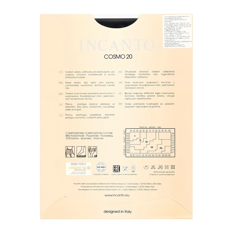 Ассортимент марки сегодня весьма обширен и включает в себя: классические и фантазийные колготки, изящные чулки, теплые и комфортные зимние модели, прочные носки и гольфы. Большой выбор цветов и размеров неизменно привлекает самый широкий круг поклонниц марки и по праву делает бренд INCANTO одним из самых популярных в Восточной Европе.