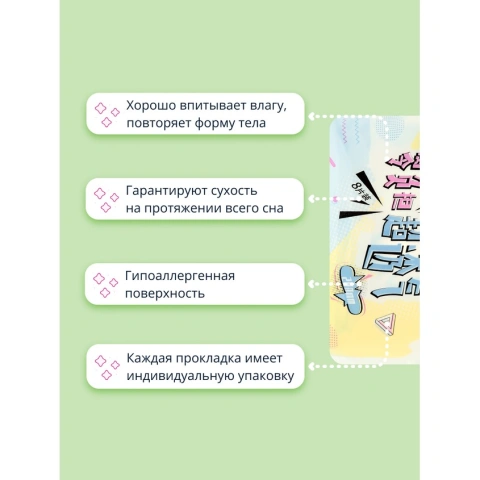 Качественные ночные прокладки обеспечивают спокойный, безмятежный сон. Нижний влагонепроницаемый слой с клеящей основой надежно фиксирует прокладки на одежде, средний, с абсорбирующим материалом (целлюлозой, гелеобразным веществом) поглощает и распределяет влагу по всей длине, а верхний, дышащий, комфортно прилегает к телу.
