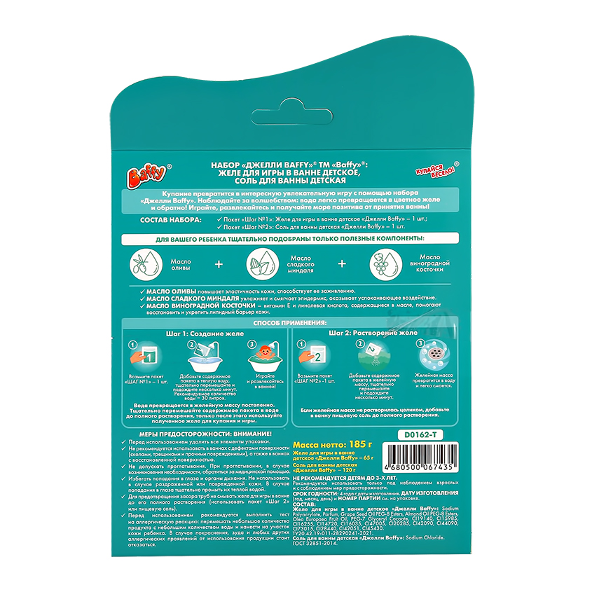 • Пакет «Шаг №1» (желеобразователь): Желе для игры в ванне детское «Джелли Baffy» (65 г)– 1 шт.; • Пакет «Шаг №2» (желерастворитель): Соль для ванны детская «Джелли Baffy» (120 г) – 1 шт.