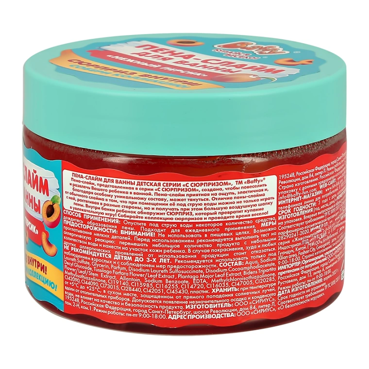 Уникальная пена-слайм "Нежный персик", представленная в серии "С СЮРПРИЗОМ", создана, чтобы повеселить Вашего ребенка в ванной. Пена-слайм приятная на ощупь, эластичная и, благодаря особому уникальному составу, может тянуться. При помещении её под струю воды можно не только играть с ней, растягивая в разные стороны, но и получать при этом большую воздушную шапку пены. Внутри банки ребенок обнаружит СЮРПРИЗ! Собирайте коллекцию сюрпризов и проводите время весело! В состав включены 4 полезных компонента, имеющих 4 активных действия: органический экстракт МАТЬ-И-МАЧЕХИ успокаивает кожу, способствуя ее восстановлению; органический экстракт ПОДОРОЖНИКА обладает противовоспалительным эффектом, помогает успокоить кожу после укусов комаров и насекомых; органический экстракт ЧЕРЕДЫ помогает бороться с царапинами и ссадинами, способствует заживлению; АЛЛАНТОИН помогает устранять раздражения и увлажнить кожу. Не содержит: SLS; силиконов; парабенов; фталатов. Не раздражает кожу. Имеет нежный аромат персика. 300 мл.