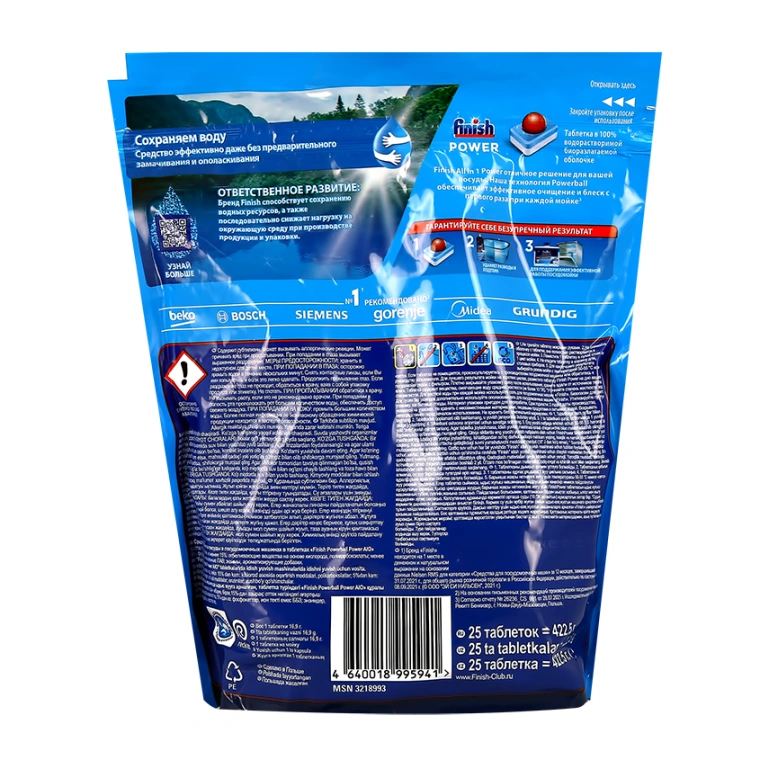 Таблетки All in 1 MAX идеальны для использования на коротких циклах - таблетки быстро растворяются. Таблетки не нужно разворачивать! Рекомендации от Finish для наилучших результатов. Жесткая вода способствует образованию накипи, пятен и подтеков на Вашей посуде. Жесткая вода снижает эффективность работы Вашей посудомоечной машины. Содержащаяся в таблетках специальная соль эффективно действует в мягкой/ средней жесткости и жесткой воде до 26°e (21°dH). При очень жесткой воде дополнительно используйте специальную соль Finish. Продукт не защищает посуду от механических повреждений и не может восстановить поврежденную посуду.