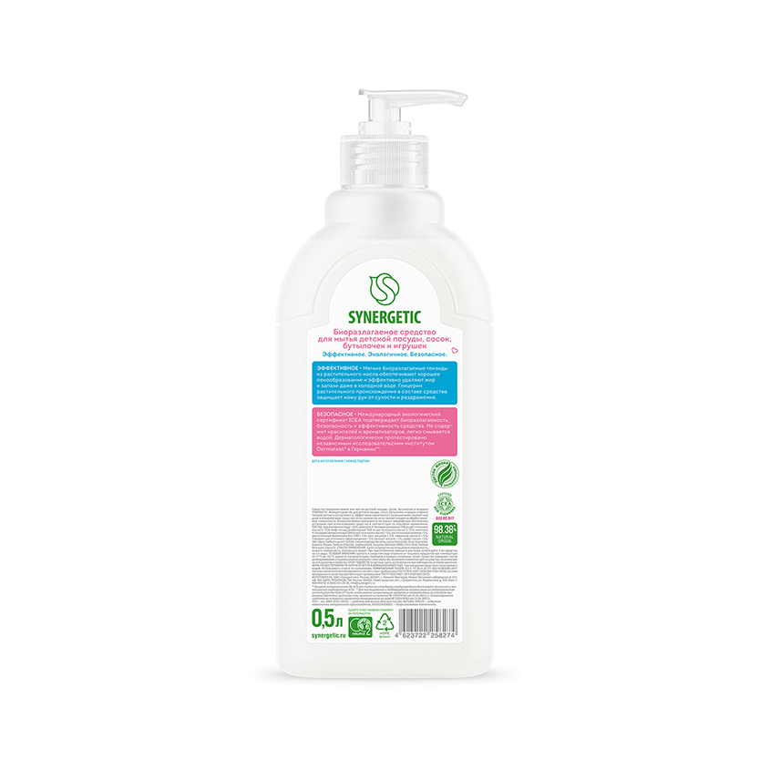 Концентрированный антибактериальный гель SYNERGETIC – это экологичное, безопасное и эффективное средство для мытья детской посуды, игрушек, сосок, бутылочек, овощей и фруктов. Гель полностью смывается водой и не оставляет следов на поверхности. Устраняет жир и запахи даже в холодной воде. Мягкие биоразлагаемые тензиды удаляют органические загрязнения с посуды и обеспечивают хорошее пенообразование, не вызывая раздражения кожи рук. Гель для детской посуды не содержит отдушек и красителей, поэтому подходит для людей с чувствительной кожей рук. Натуральный растительный глицерин в составе геля защищает кожу рук от сухости и раздражения и обеспечивает антисептический эффект, благодаря антибактериальным свойствам. Гель для посуды SYNERGETIC сертифицирован в Итальянском институте этической и экологической сертификации ICEA и имеет международный сертификат, подтверждающий биоразлагаемость, безопасность и эффективность средства на уровне лидеров европейского рынка бытовой химии.