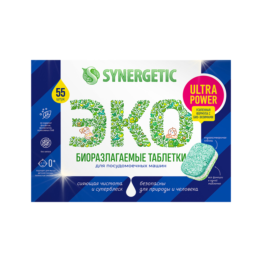 Биоразлагаемые бесфосфатные таблетки для посудомоечных машин SYNERGETIC ULTRA POWER в водорастворимой плёнке — это эффективное, экологичное и безопасное средство, которое обеспечивает сияющую чистоту посуды и столовых приборов. Новая усиленная формула с био-энзимами эффективно удаляет жир и сложные загрязнения даже в жёсткой воде и на коротких программах мойки (не менее 60 минут). Протеаза удаляет запёкшиеся и засохшие белковые загрязнения (такие как мясной фарш, яичный желток, паста, крем-брюле, пригоревшее молоко и др.), амилаза удаляет запёкшиеся и засохшие крахмальные загрязнения (например, мука, макароны, паста, рис, картофель и др.). Активные соединения кислорода и ПАВ на растительной основе интенсивно расщепляют загрязнения для безупречного результата. Специальные добавки предотвращают повторное оседание загрязнений, помутнение стекла и придают посуде кристальный блеск без разводов, а также защищают машину от накипи. Таблетки подходят для мытья детской посуды, полностью смываются водой. Без запаха. Не содержат фосфатов, фосфонатов, агрессивных ПАВ и искусственных ароматизаторов. Предназначены для мытья посуды и столовых приборов в посудомоечных машинах любого типа. Безопасны для природы и человека. Рекомендованы производителем бытовой техники из Европы Hansa. Биоразлагаемые компоненты не вредят микрофлоре септических установок. Для достижения максимального результата и при очень жёсткой воде рекомендуется применение специальной соли и ополаскивателя SYNERGETIC.