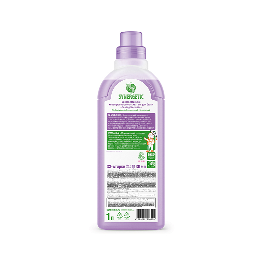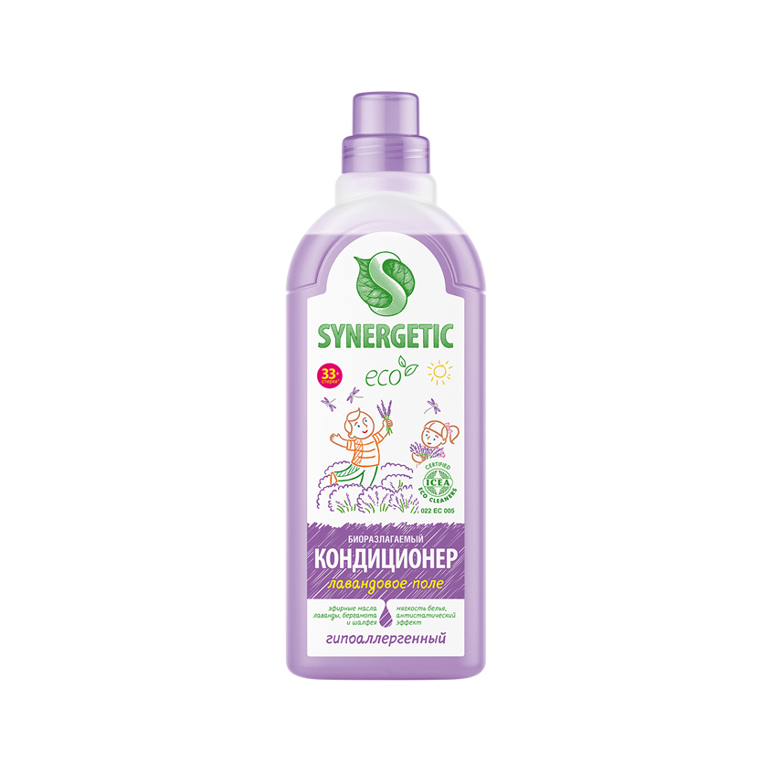 Гипоаллергенный кондиционер-ополаскиватель для белья SYNERGETIC «Лавандовое поле» – высокоэффективное средство, бережно ухаживающее за всеми типами ткани и придающее особую мягкость белью после стирки. Экологичный и безопасный биоразлагаемый кондиционер-ополаскиватель