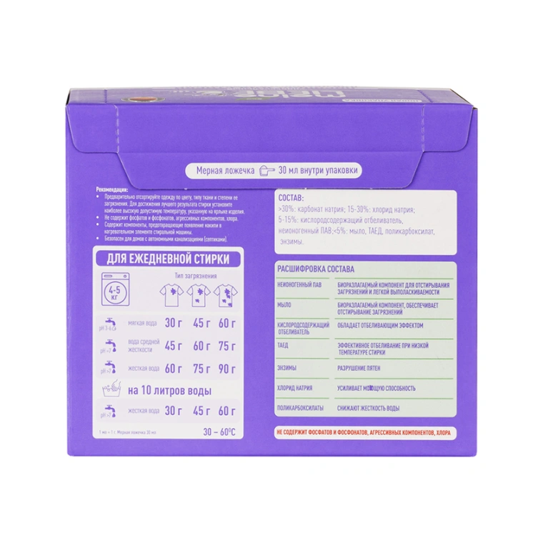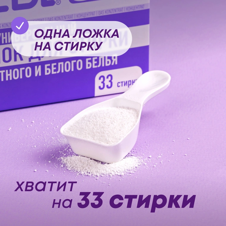 Средство для стирки не требует предварительного замачивания и предотвращают появление накипи, а концентрированной формулы хватит на 33+ стирок при полной загрузке машинки на 4-5 кг сухого белья, что до 5х раз экономичнее обычного порошка. Внутри упаковки вы найдете мерную ложечку для точной дозировки средства.