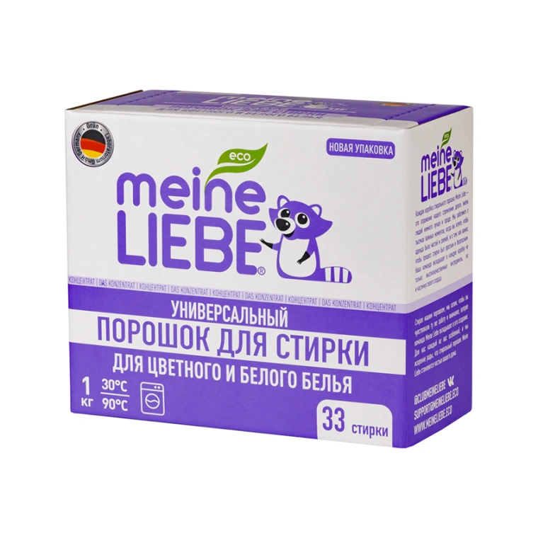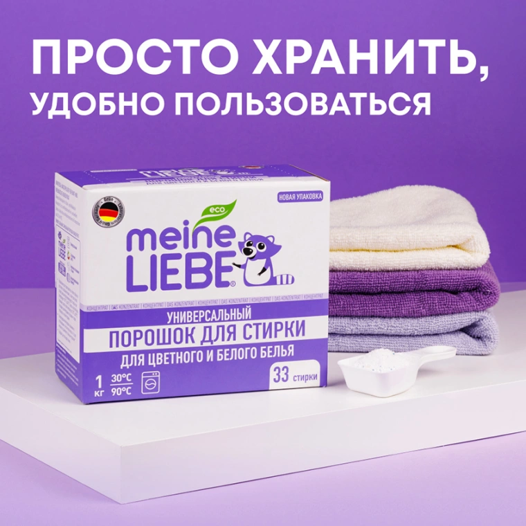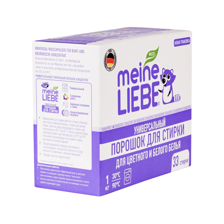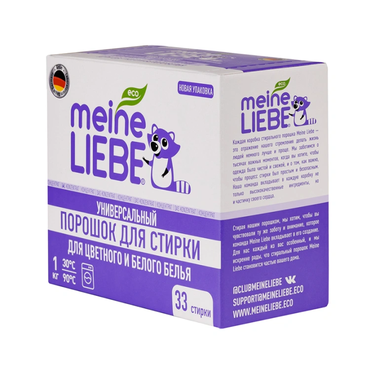 Универсальный стиральный порошок-концентрат Meine Liebe (Майне Либе) – это экологичное средство, разработанное для эффективного ухода за цветными и белыми тканями. Активный кислород в составе порошка помогает удалять пятна и возвращать первоначальную белизну белым тканям, а цветным придает яркость. Уникальная система энзимов качественно удаляет даже самые трудновыводимые и застарелые загрязнения без необходимости предварительного замачивания, сохраняет цвет и структуру тканей.
