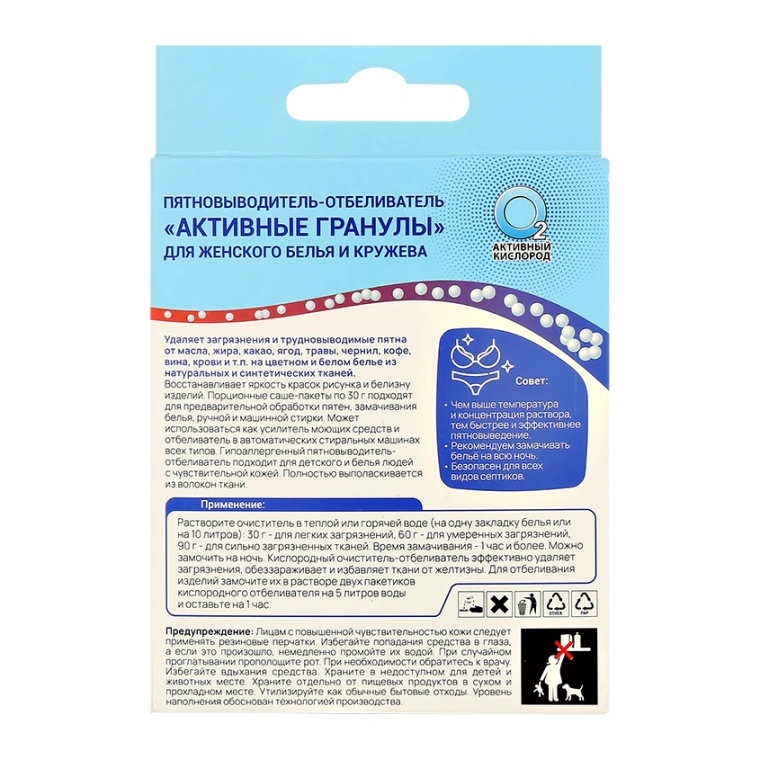 Удаляет загрязнения и трудновыводимые пятна от масла, жира, какао, ягод, травы, чернил, кофе, вина, крови и т.п. на цветном и белом белье из натуральных и синтетических тканей. Восстанавливает яркость красок рисунка и белизну изделий. Порционные саше-пакеты по 30 г подходят для предварительной обработки пятен, замачивания белья, ручной и машинной стирки. Может использоваться как усилитель моющих средств и отбеливатель в автоматических стиральных машинах всех типов. Гипоаллергенный пятновыводитель- отбеливатель подходит для детского и белья людей с чувствительной кожей. Полностью выполаскивается из волокон ткани.
