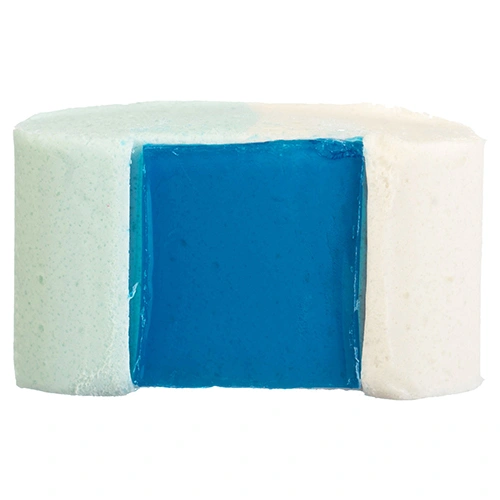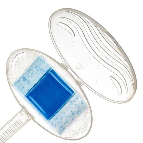 Не снимая водорастворимую пленку, закрепите блок на ободе унитаза так, чтобы он полностью омывался
