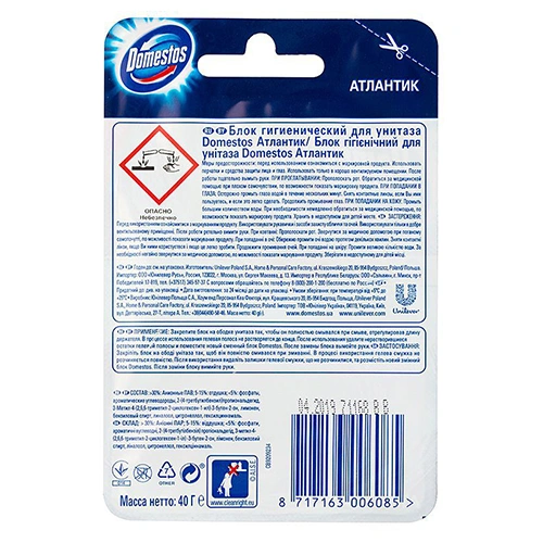 при смыве. В процессе использования гелевая полоса не растворяется до конца. После использования удалите нерастворившиеся остатки гелевой полосы и поместите новый сменный блок Domestos. После замены блока вымойте руки.