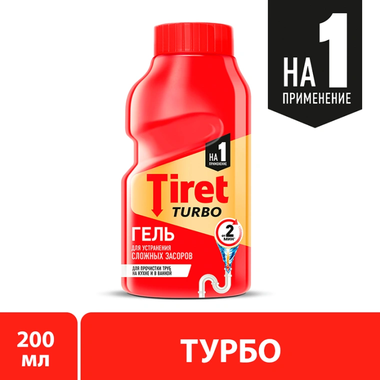 Tiret Турбо - гель для удаления засоров в канализационных трубах, 200 мл. - Эффективно и быстро справляется даже с очень сложными засорами; - Густая формула геля позволяет средству проникать в трубы даже в стоячей воде; - Компактная упаковка продукта, рассчитанная на 1 применение, очень удобна использовании, и не будет занимать много места дома; - Действует от 2 минут; - Идеально подходит и безопасен для металлических и пластиковых труб. Меры предосторожности: Хранить в местах, недоступных для детей. Избегать попадания на кожу и в глаза. Рекомендуется использовать перчатки. В случае попадания в глаза промыть большим количеством воды и обратиться к врачу (показав упаковку). При контакте с кожей промыть пораженный участок большим количеством воды.