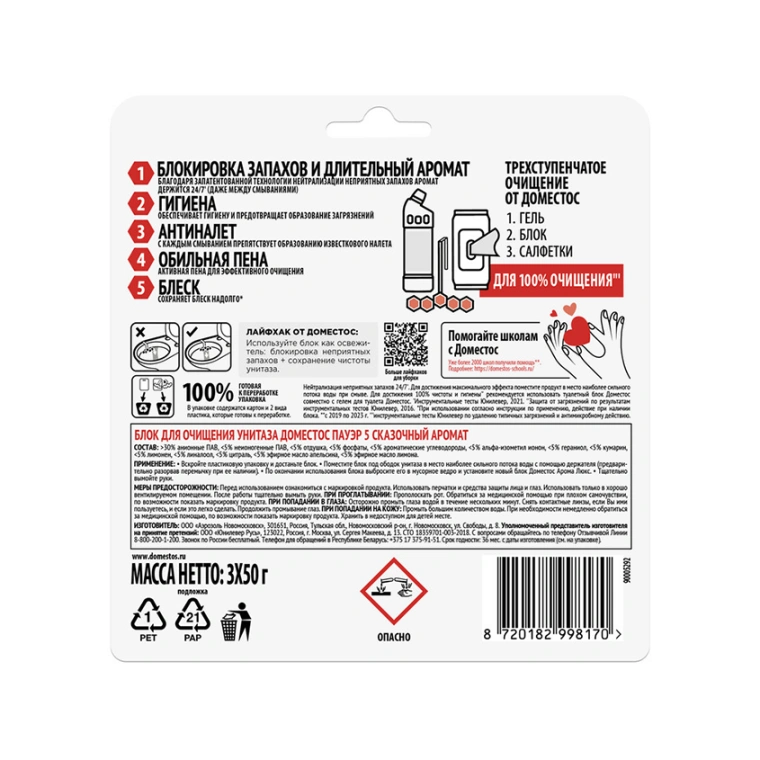 Блок Доместос для унитаза содержит активное вещество, которое под действием напора воды ополаскивает всю поверхность унитаза, защищая от бактерий и помогая предотвращать известковый налет.
