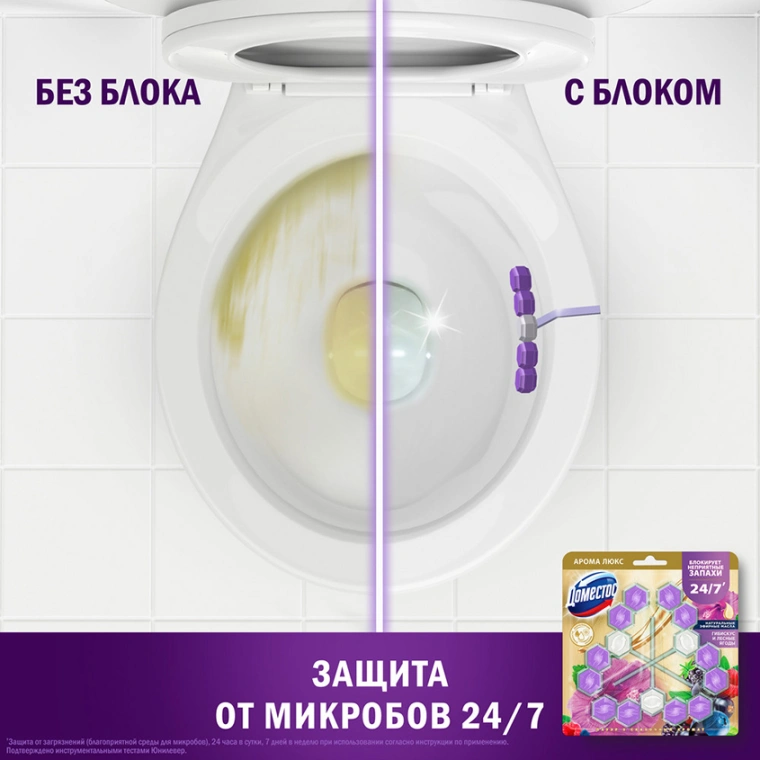 '' Защита от загрязнений, благоприятной среды для микробов 24 часа, 7 дней в неделю, при наличии блока*По результатам тестов Юнилевер по сравнению со стикером для очищения унитаза Доместос.