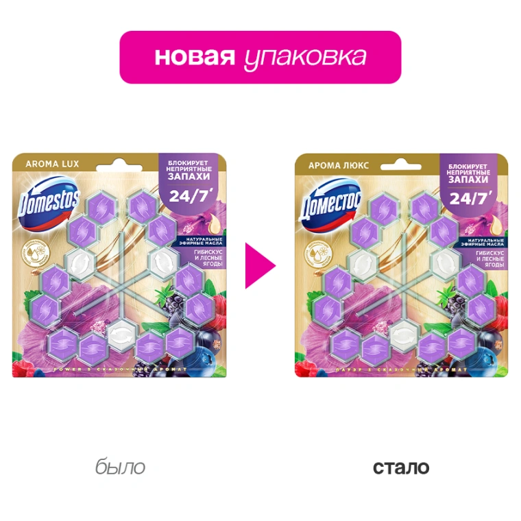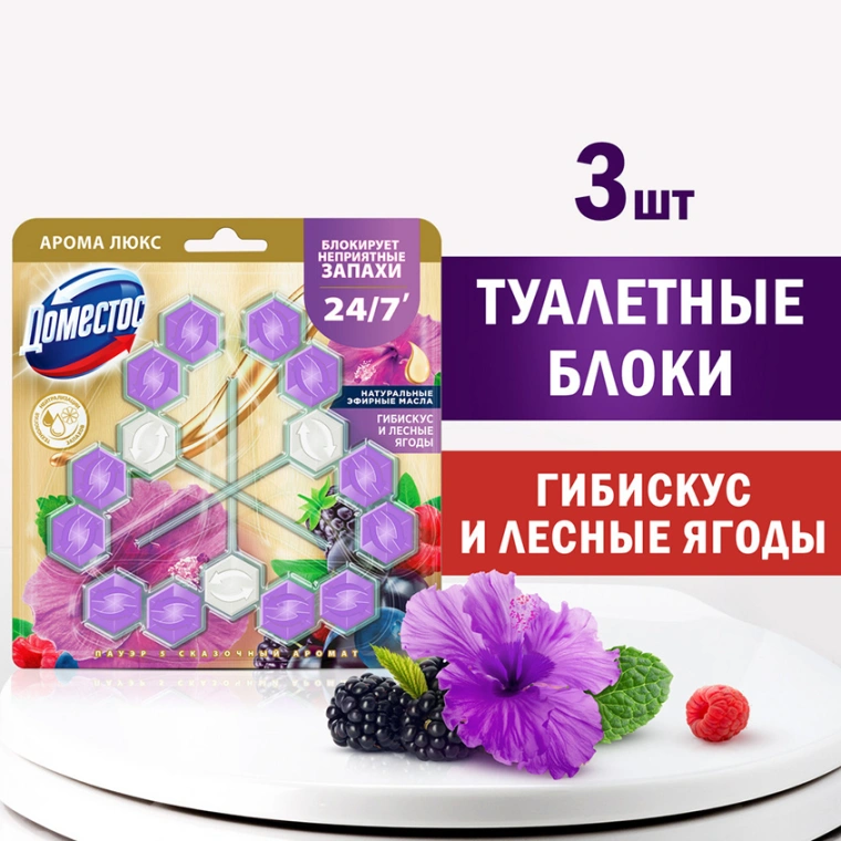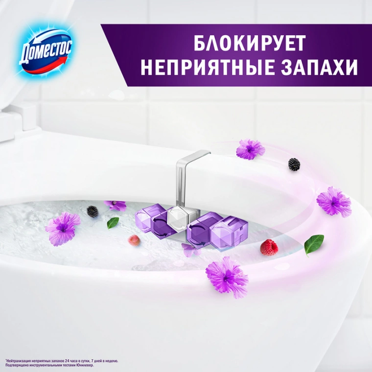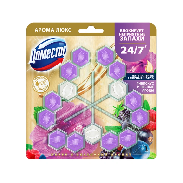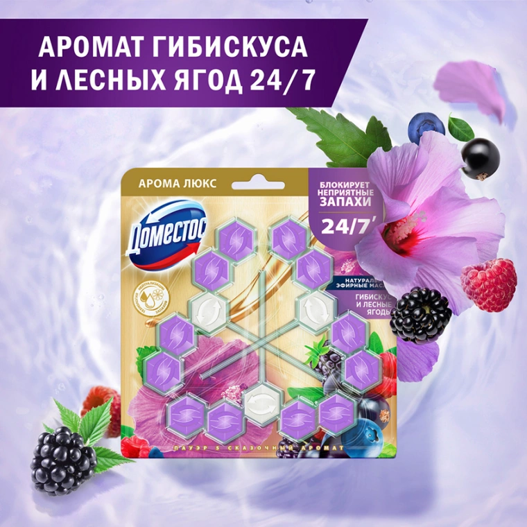 При каждом смывании появляется свежий аромат пряного гибискуса и сочных лесных ягод на срок 24 часов' и обильная пена, которая борется с налетом, поддерживая гигиену и блеск поверхности унитаза. С новыми ароматами от Доместос можно наслаждаться приятными и яркими ароматами цветов, фруктов и ягод не выходя из дома.