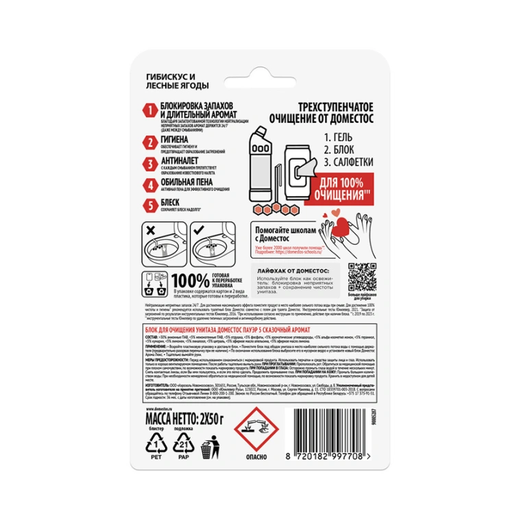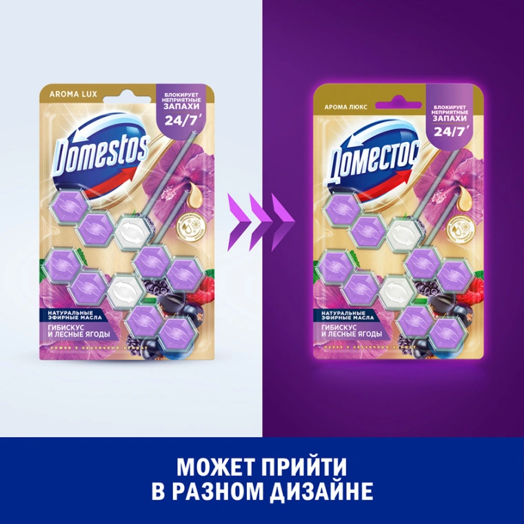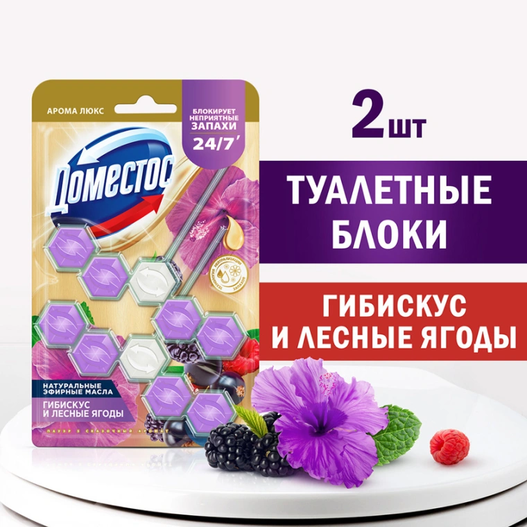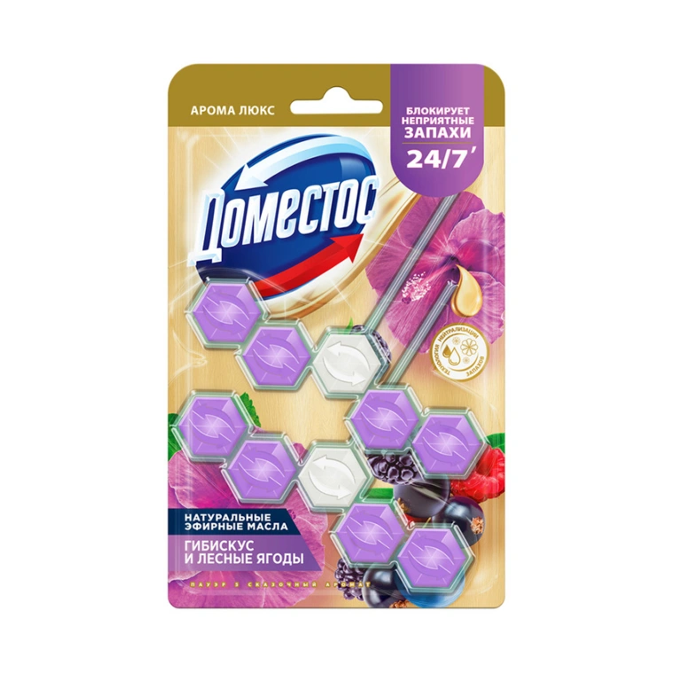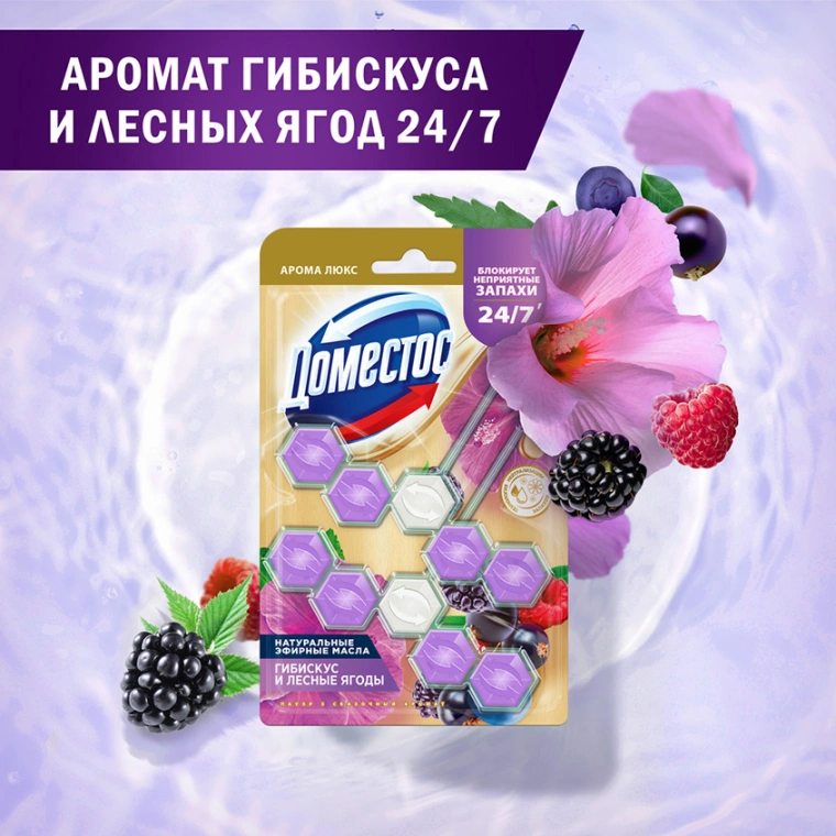 При каждом смывании появляется свежий аромат пряного гибискуса и сочных лесных ягод на срок 24 часов' и обильная пена, которая борется с налетом, поддерживая гигиену и блеск поверхности унитаза. С новыми ароматами от Доместос можно наслаждаться приятными и яркими ароматами цветов, фруктов и ягод не выходя из дома.