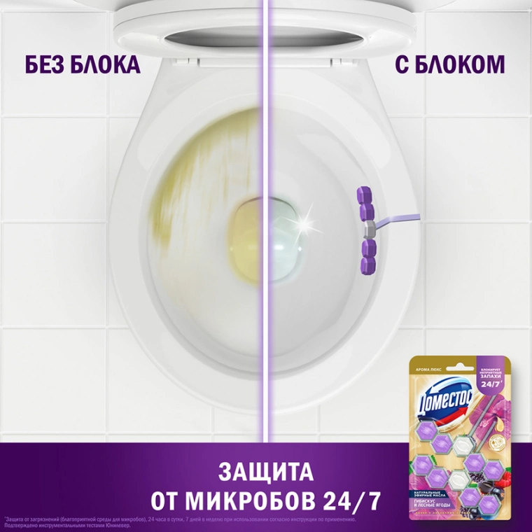 '' Защита от загрязнений, благоприятной среды для микробов 24 часа, 7 дней в неделю, при наличии блока*По результатам тестов Юнилевер по сравнению со стикером для очищения унитаза Доместос.