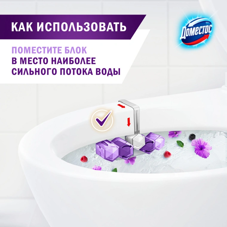Блок Доместос для унитаза содержит активное вещество, которое под действием напора воды ополаскивает всю поверхность унитаза, защищая от бактерий и помогая предотвращать известковый налет.
