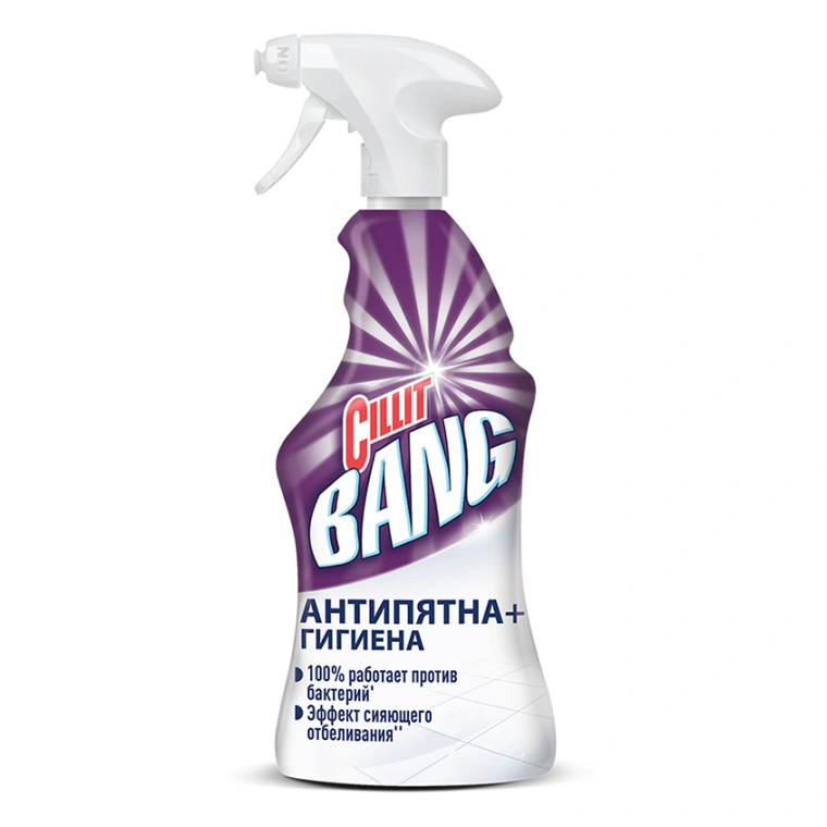 Мощное средства Cillit Bang АнтиПЯТНА+ГИГИЕНА. BANG и грязи как не бывало!Попробуйте по-настоящему мощное средство CILLIT BANG антиПЯТНА+ГИГИЕНА!Оно эффективно устраняет бактерии и побеждает пятна
