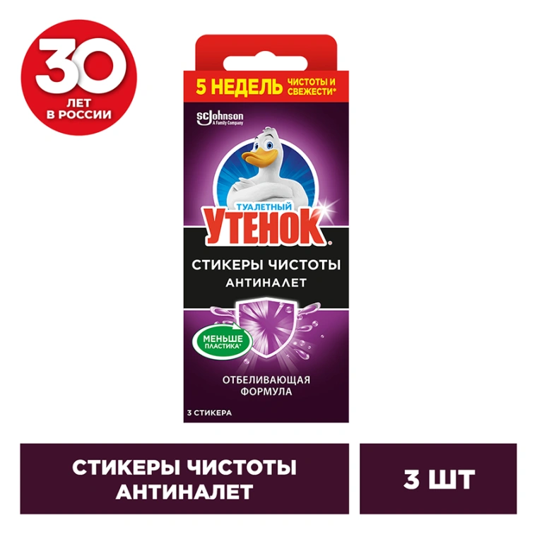Благодаря очистителю Туалетный утенок Стикер чистоты на поверхности унитаза образуется защитный слой, который препятствует образованию минеральных отложений, являющихся очагами скопления микробов. Очиститель крепится внутри унитаза ниже ободка на сухую поверхность. Обладает приятным ароматом. Стикера хватает более, чем на 100 смываний. Он полностью растворяется в воде.