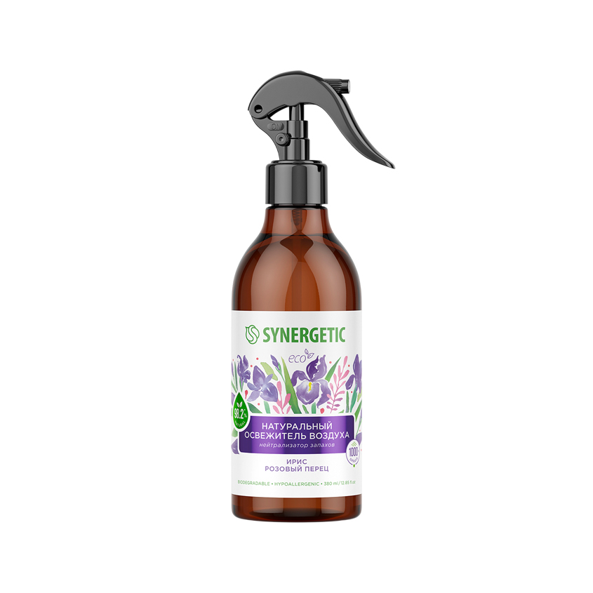 Биоразлагаемый освежитель воздуха, нейтрализатор запахов SYNERGETIC «Ирис и розовый перец» на водной основе на 98,2% состоит из натуральных компонентов. Парфюмерная композиция с эфирными маслами герани, розы и ириса наполняет воздух пряным цветочным ароматом. Гипоаллергенная формула безопасна для людей и животных.