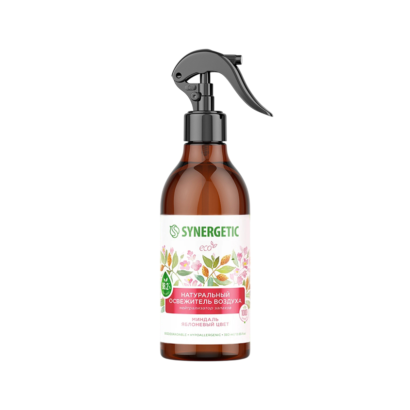 Биоразлагаемый освежитель воздуха, нейтрализатор запахов SYNERGETIC «Миндаль и яблоневый цвет» на водной основе на 98,2% состоит из натуральных компонентов. Парфюмерная композиция с эфирными маслами бергамота, корицы и сандала наполняет воздух сладким цветочным ароматом. Гипоаллергенная формула безопасна для людей и животных.