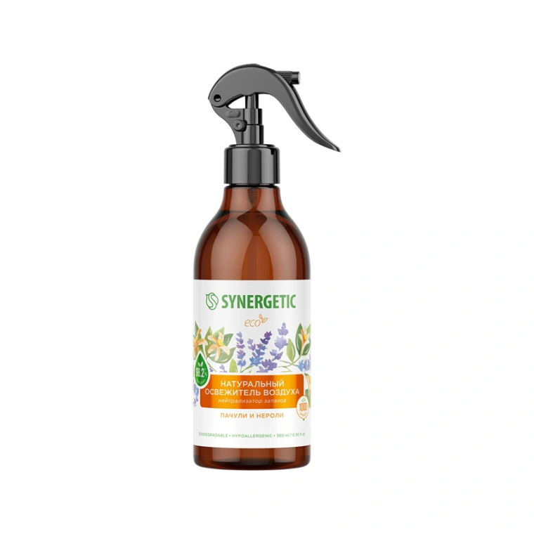 Биоразлагаемый освежитель воздуха, нейтрализатор запахов SYNERGETIC «Пачули и нероли» на водной основе на 98,2% состоит из натуральных компонентов. Парфюмерная композиция с эфирными маслами сандала, нероли и пачули наполняет воздух цитрусовым древесным ароматом. Гипоаллергенная формула безопасна для людей и животных.