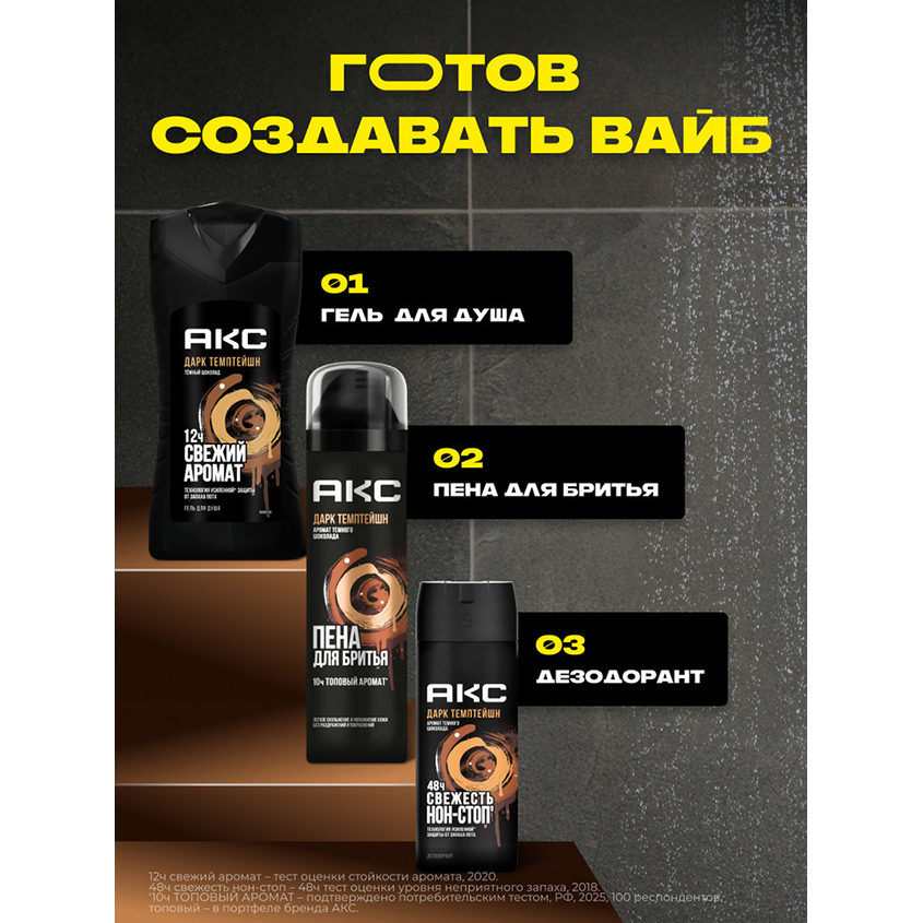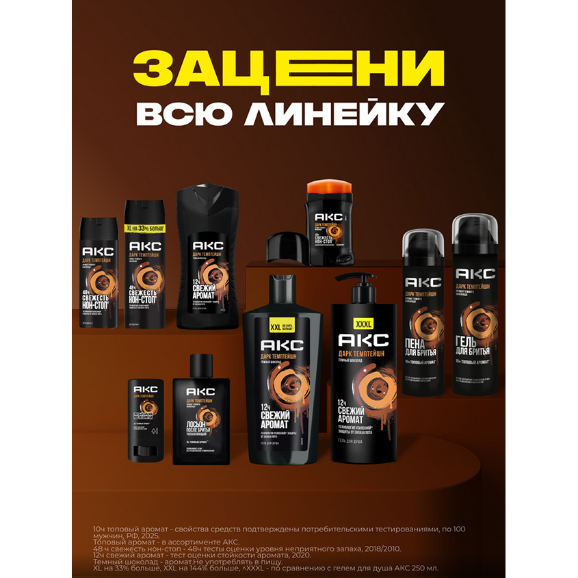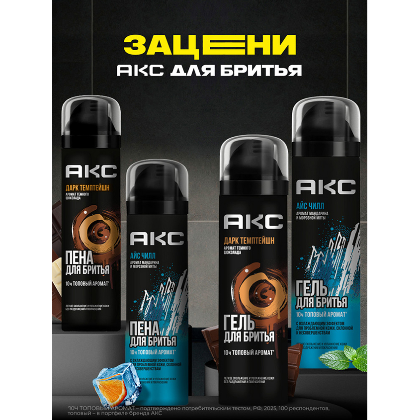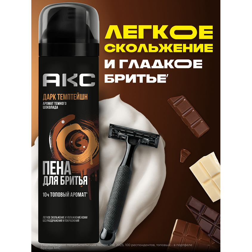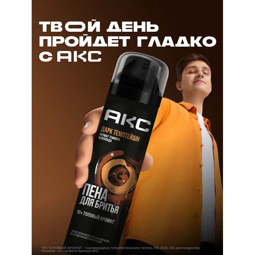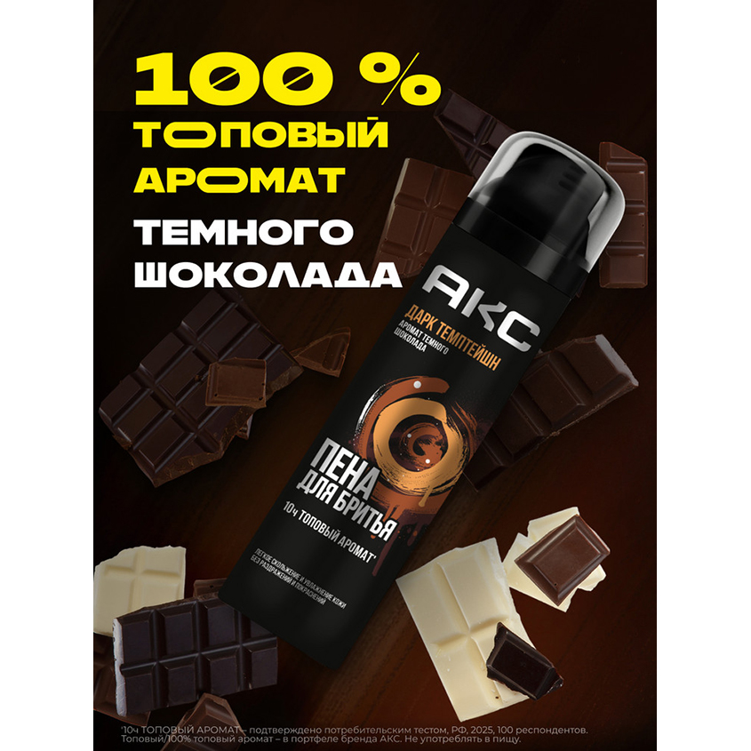 "Пена для бритья для мужчин увлажняющая Акс Дарк Темптейшн – это идеальное косметическое средство для ухода за кожей с топовым* запахом темного шоколада, разработанное для взрослых мужчин и подростков с 14 лет с любым типом кожи лица.