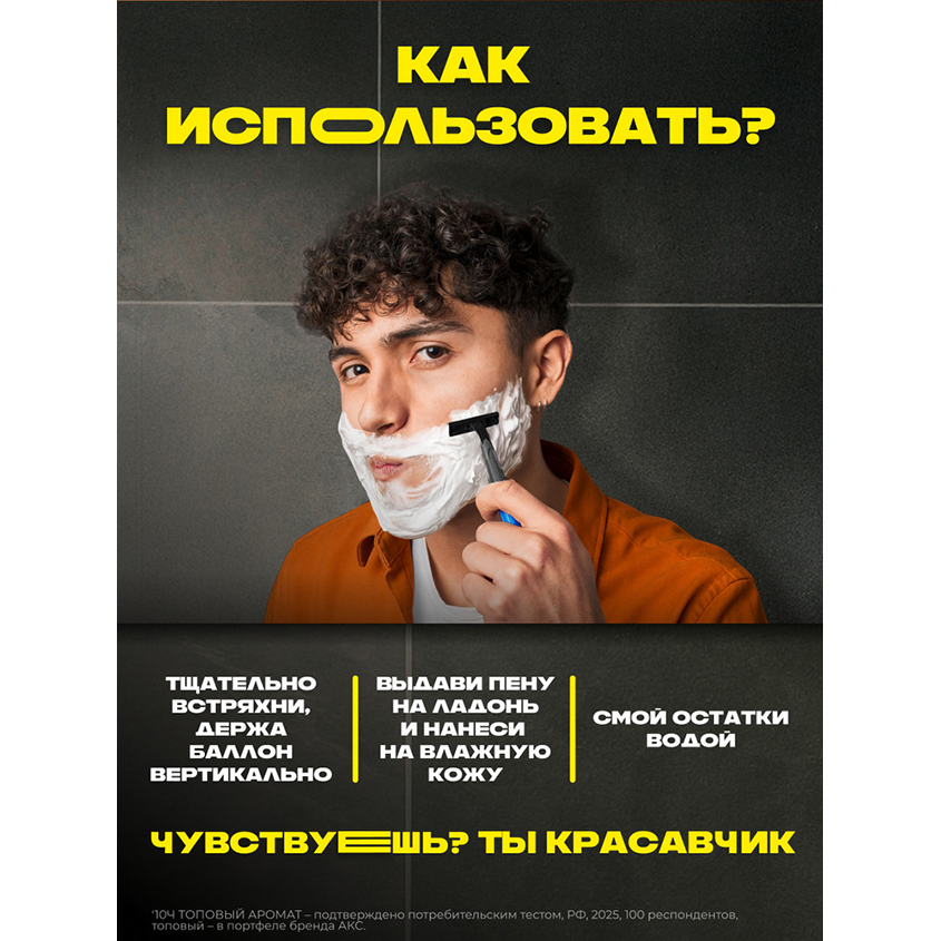 Включи пену для бритья для сухой и чувствительной кожи Акс в свой утренний ежедневный ритуал по уходу за собой, почувствуй неповторимую* гладкость и комфорт после каждого бритья с утра и до самого вечера!