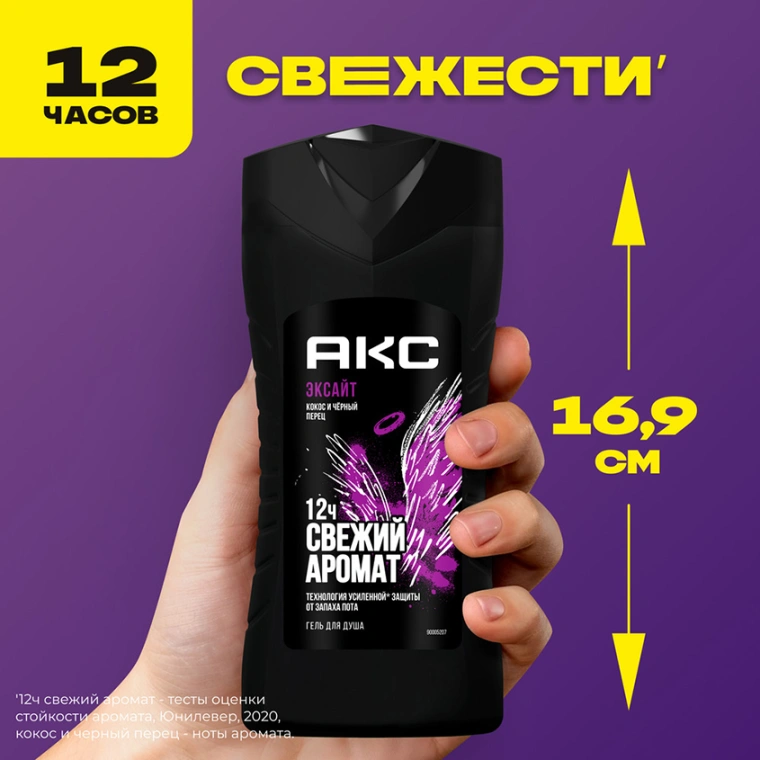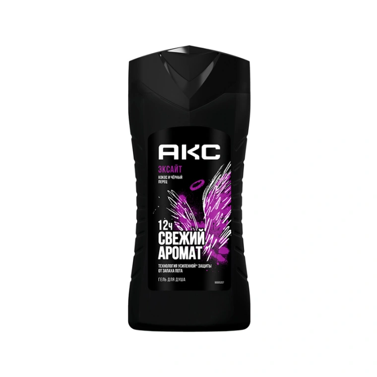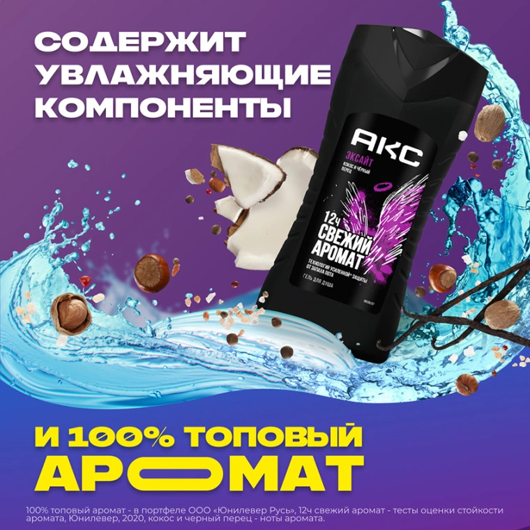 Гель для душа для мужчин ЭКСАЙТ с ароматом кокоса и черного перца разработан на основе революционной* формулы 2в1, которая включает в себя топовый* запах и нереальную свежесть на весь день. Гель для душа ароматизированный Акс - это целых 12 часов** 100% уверенности в себе! Вполне достаточно, чтобы навсегда покорить ее сердце или поймать удачу за хвост.