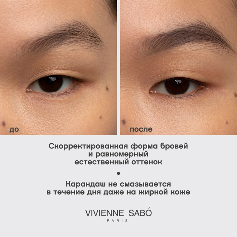 Безупречные брови за считанные секунды. Идеальные брови - это не миф! С автоматическими карандашами Brow Arcade приблизиться к идеалу стало просто. С одной стороны карандаша - тонкий стержень slim, который позволяет скорректировать форму бровей и добавить цвет, по желанию рисуя широкую или тонкую линию в технике микроблендинга, закрашивая пустоты. С другой стороны расположена щёточка-расчёска, чтобы расчесать брови и растушевать цвет. Формула на основе натуральных восков придаёт стержню карандаша стойкость. Он не размазывается и не тускнеет. Совет: Если вы не хотите менять их естественную форму и выщипывать волоски (так, кстати, часто поступают француженки), сделайте несколько осторожных штрихов карандашом VIVIENNE SABO Brow Arcade Slim там, где брови имеют неравномерную густоту, потом придайте им форму с помощью геля для бровей VIVIENNE SABO Fixateur. Такая техника штриховки носит название микроблендинг.