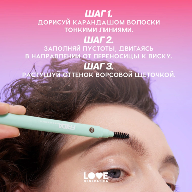 Жесткий стержень, четыре натуральных оттенка, четкая прорисовка линий — от такого карандаша не отказалась бы даже художница Кало. Но все-таки он создан для твоих красивых бровей. Начни оформлять их автоматическим карандашом FRIDA и замечай, как с каждым штрихом настроение становится лучше. Тонкий острый грифель и удобная щеточка для растушевки — в этом карандаше есть все, чтобы создать идеальные брови за пять минут.