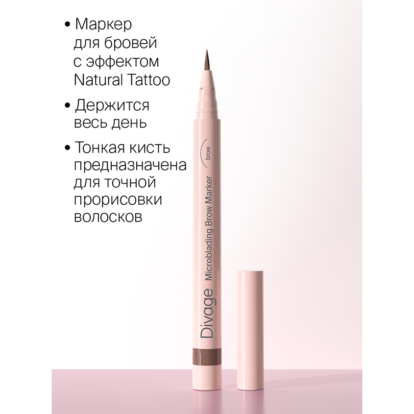 Стойкий маркер для бровей с эффектом Natural Tattoo, который держится весь день. Тонкая кисть предназначена для точной прорисовки волосков – трендовый эффект Microblading. В линейке 3 универсальных оттенка для разных цветотипов, подходящие российским девушкам.