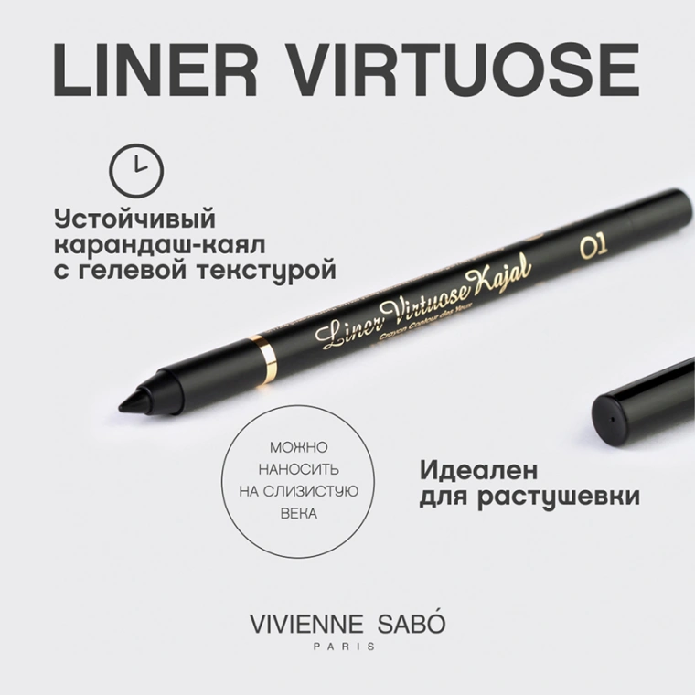 Суперстойкость и разнообразие текстур. Устойчивый гелевый карандаш-каял Virtuose с мягкой кремовой текстурой рисует идеальную тонкую линию, которая держится на коже весь день! Гелевая суперустойчивая формула разработана специально для использования на слизистой века и для прорисовки межресничного контура. Супервысокая пигментация обеспечивает насыщенный цвет линии даже при самом легком касании карандаша. А натуральные воски обеспечивают мягкое нанесение и растушевку. Совет: Проведите карандашом-кайалом по внутреннему краю нижнего века для создания эффекта пронзительного взгляда. Благодаря нежной шелковистой текстуре карандаш прекрасно растушёвывается, что делает его незаменимым продуктом в макияже смоки айз.