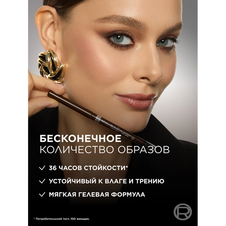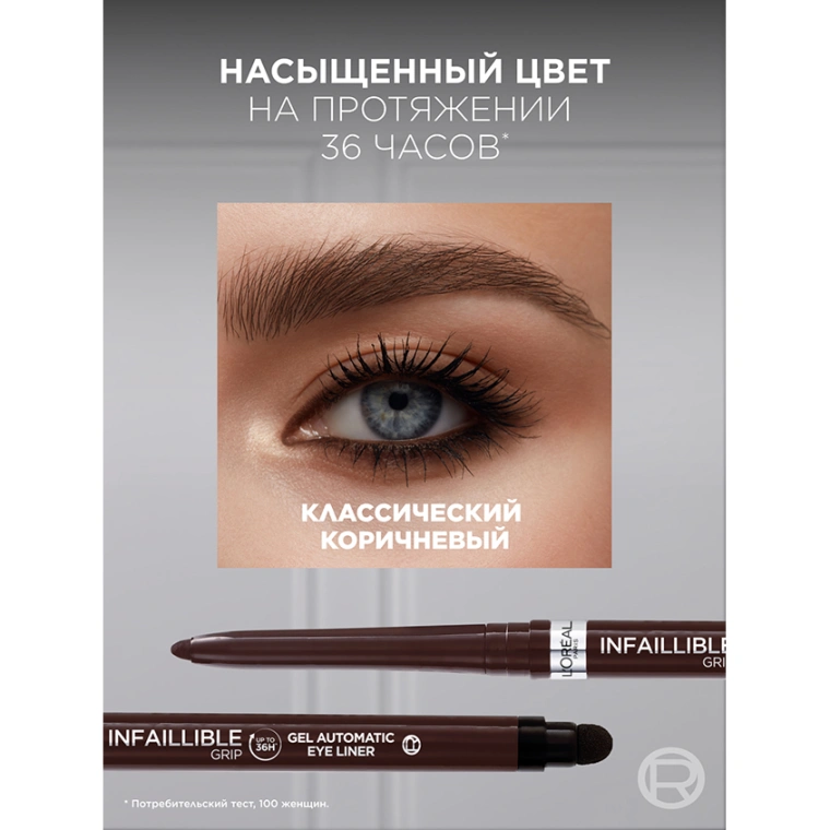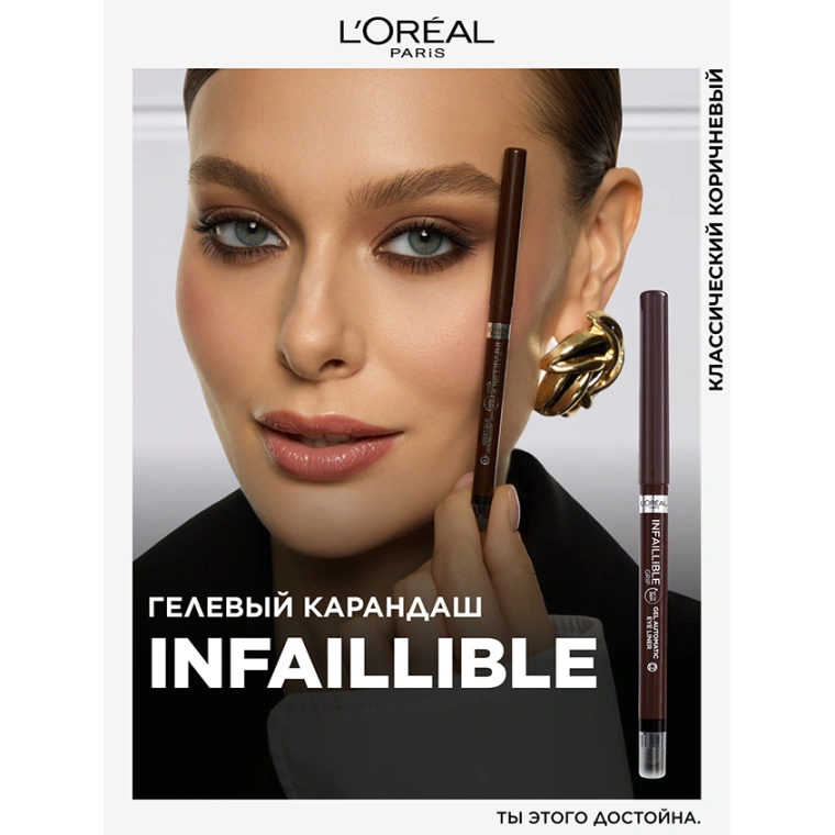 Наш первый стойкий автоматический гель-карандаш от L'Oreal Paris (Л'Ореаль Париж) Infaillible Grip, вдохновленный инновационными технологиями. Гелевая формула для плавного скольжения и легкого нанесения, обеспечивающая до 36 часов стойкости к воде и трению. Встроенный спонж для комфортной и точной растушевки нарисованных линий, способствует созданию вашего индивидуального образа.