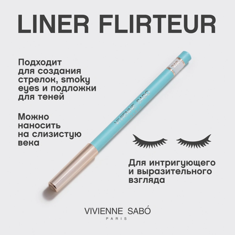 LINER FLIRTEUR — линейка карандашей для глаз от VIVIENNE SABÓ в семи универсальных оттенках. Ими можно нарисовать аккуратные стрелки, сделать smoky eyes, расставить легкие акценты или создать подложку для теней. Благодаря комплексу восков в составе текстура LINER FLIRTEUR стойко держится на коже, легко наносится, растушевывается и не отпечатывается. Карандаш не царапает веко и не ломается, а его классический деревянный корпус в цвете тиффани удобно точить. Не важно, какое у тебя сегодня настроение: новые карандаши LINER FLIRTEUR сделают твой взгляд интригующим и выразительным.