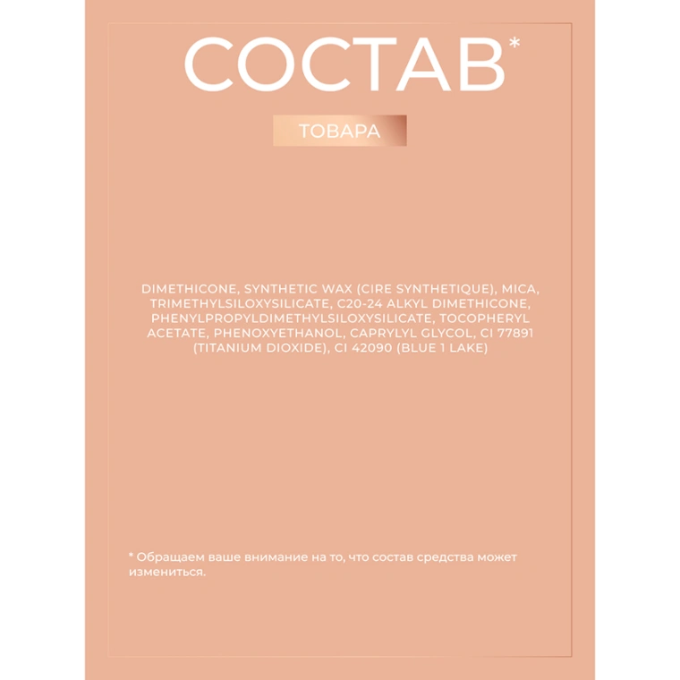 DIMETHICONE, SYNTHETIC WAX (CIRE SYNTHETIQUE), TRIMETHYLSILOXYSILICATE, C20-24 ALKYL DIMETHICONE, PHENYLPROPYLDIMETHYLSILOXYSILICATE, TOCOPHERYL ACETATE, PHENOXYETHANOL, CAPRYLYL GLYCOL, CI 77891 (TITANIUM DIOXIDE), CI 42090 (BLUE 1 LAKE), CI 19140 (YELLOW 5 LAKE).