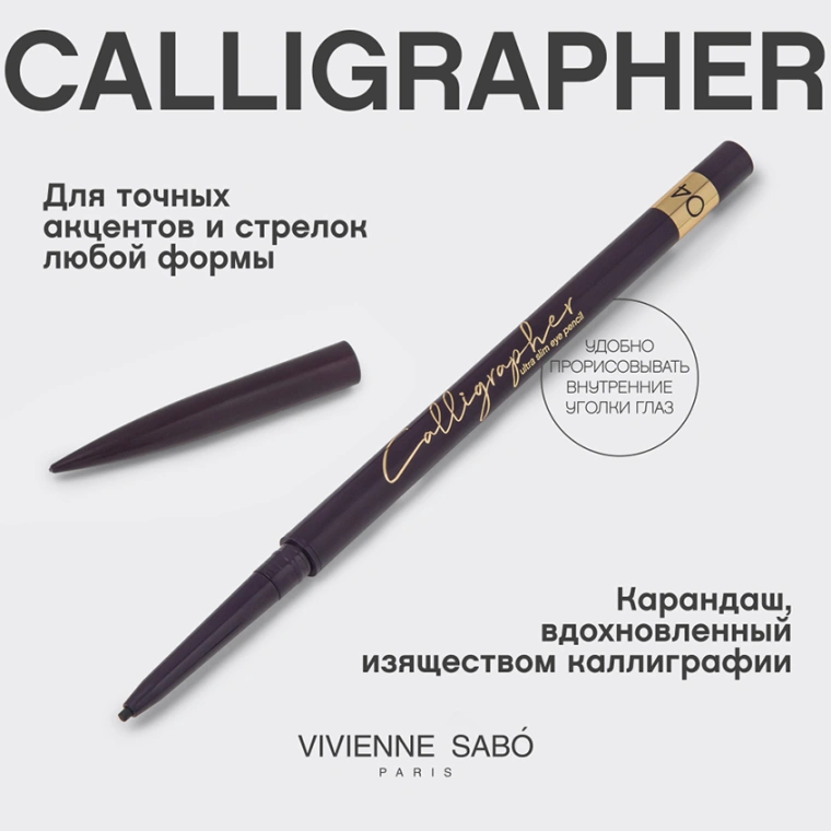 CALLIGRAPHER от VIVIENNE SABÓ — это не просто ультратонкий карандаш для глаз, а истинное произведение искусства, вдохновленное изяществом каллиграфии. С его помощью ты сможешь создавать утонченные линии и точные акценты, которые подчеркнут естественную привлекательность твоих глаз. Как и в каллиграфическом искусстве, где каждый штрих имеет значение и рассказывает свою уникальную историю, этот автоматический карандаш позволяет играть с толщиной линий и их стилем, добавляя индивидуальность в образ. С CALLIGRAPHER ты легко освоишь технику графики на веках: его форма с ультратонким стержнем толщиной всего 1 мм обеспечивает мастерское и точное нанесение. Эстетика Франции, где искусство и мода переплетаются на каждом шагу, пронизывает этот продукт, отражая утонченный вкус и стремление к совершенству. Его дизайн сочетает в себе элегантность и современность. Упаковка в тон карандаша имеет стильную золотую печать и крышку зауженной формы, которая удобно лежит в руке, подчеркивает изящество и тонкость продукта. Он станет идеальным инструментом для создания изысканных и в то же время выразительных макияжей, которые привлекают внимание и восхищают окружающих. С CALLIGRAPHER твоя рука станет кистью, а глаза — холстом для любого творческого замысла.