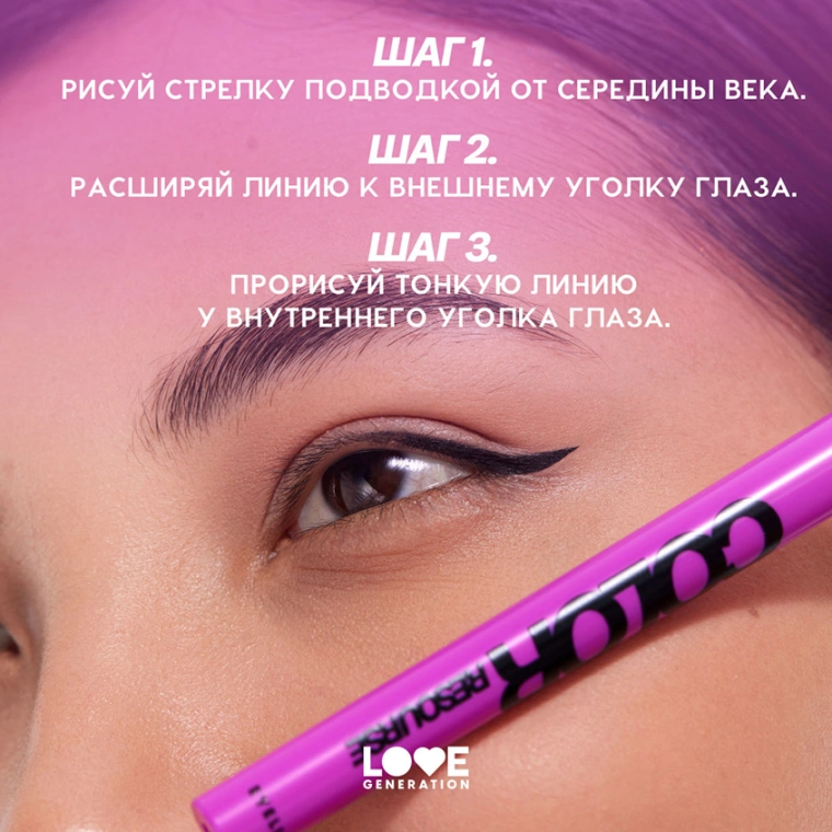 Нарисовала стрелки маркером COLOR RESOURSE, и уже в ресурсе! Выбирай, макияж с каким из шести оттенков отразит твой внутренний мир сегодня: черным, голубым, сиреневым, розовым, оранжевым или мятным. Маркером со стойкой пигментированной текстурой и фетровым аппликатором удобно выводить линии и расставлять акценты как на верхнем, так и на нижнем веке.