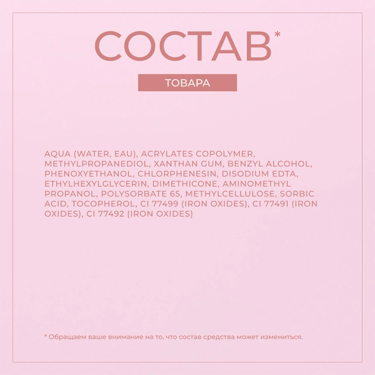 AQUA (WATER, EAU), ACRYLATES COPOLYMER, METHYLPROPANEDIOL, XANTHAN GUM, BENZYL ALCOHOL, PHENOXYETHANOL, CHLORPHENESIN, DISODIUM EDTA, ETHYLHEXYLGLYCERIN, DIMETHICONE, AMINOMETHYL PROPANOL, POLYSORBATE 65, METHYLCELLULOSE, SORBIC ACID, TOCOPHEROL, CI 77499 (IRON OXIDES), CI 77491 (IRON OXIDES), CI 77492 (IRON OXIDES).