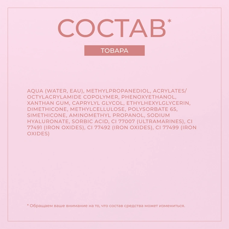 AQUA (WATER, EAU), ACRYLATES COPOLYMER, METHYLPROPANEDIOL, XANTHAN GUM, BENZYL ALCOHOL, PHENOXYETHANOL, CHLORPHENESIN, DISODIUM EDTA, ETHYLHEXYLGLYCERIN, DIMETHICONE, AMINOMETHYL PROPANOL, POLYSORBATE 65, METHYLCELLULOSE, SORBIC ACID, TOCOPHEROL, CI 77499 (IRON OXIDES), CI 77491 (IRON OXIDES), CI 77492 (IRON OXIDES).