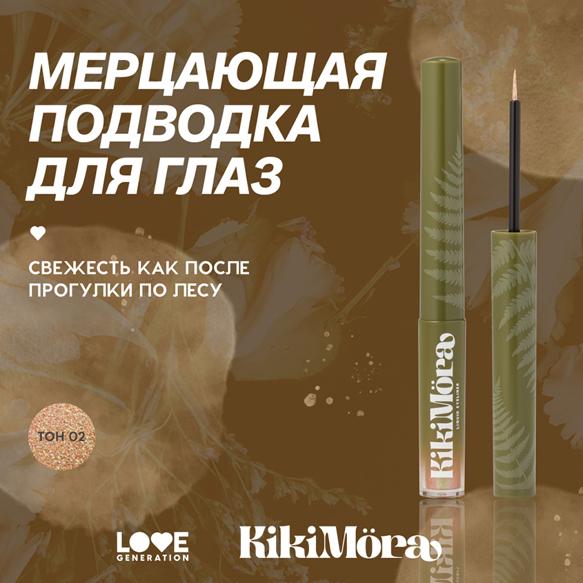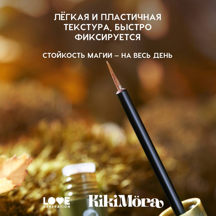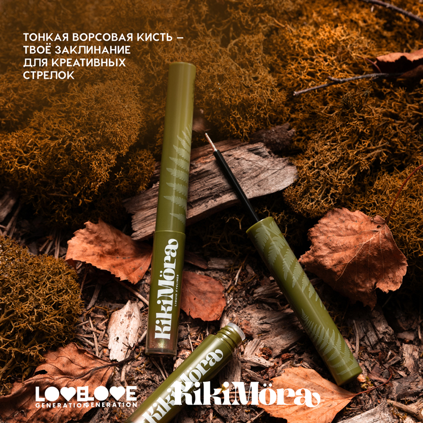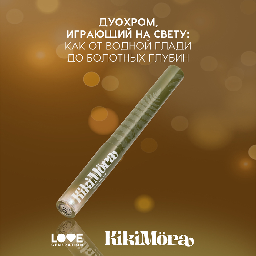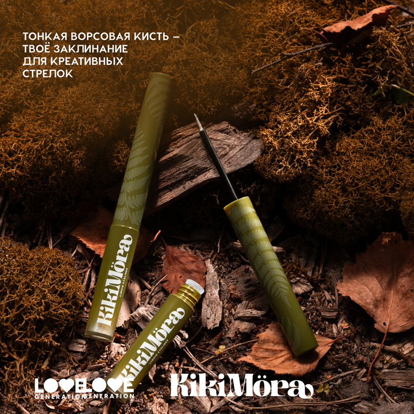 Сияющая дуохромная формула подводки для глаз KIKIMORA меняется под разным освещением, как поверхность лесного озера или таинственная болотная гладь. Легкая текстура наносится без усилий и остается яркой в течение всего дня, придавая взгляду глубину, выразительность и немного магии. Удобным аппликатором в форме тонкой ворсовой кисти легко нарисовать как классические стрелки, так и графические элементы, даже если ты новичок в макияже.