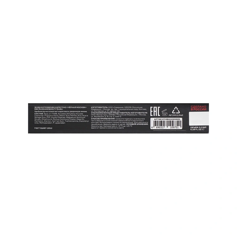 Жидкая подводка для глаз RUSSIAN BEAUTY GURU «ЧЕРНАЯ МОСКВА» — это стойкая водостойкая подводка объемом 5 мл с тонкой кисточкой из искусственного волоса, которая позволяет рисовать ровные, глянцевые черные стрелки любой толщины без разводов, осыпания или потери цвета в течение 12 часов, даже во влажной среде. Она не содержит спирта, не сушит кожу век и не повреждает ресницы, обеспечивая комфорт для ежедневного использования, подходит для чувствительных глаз и контактных линз.