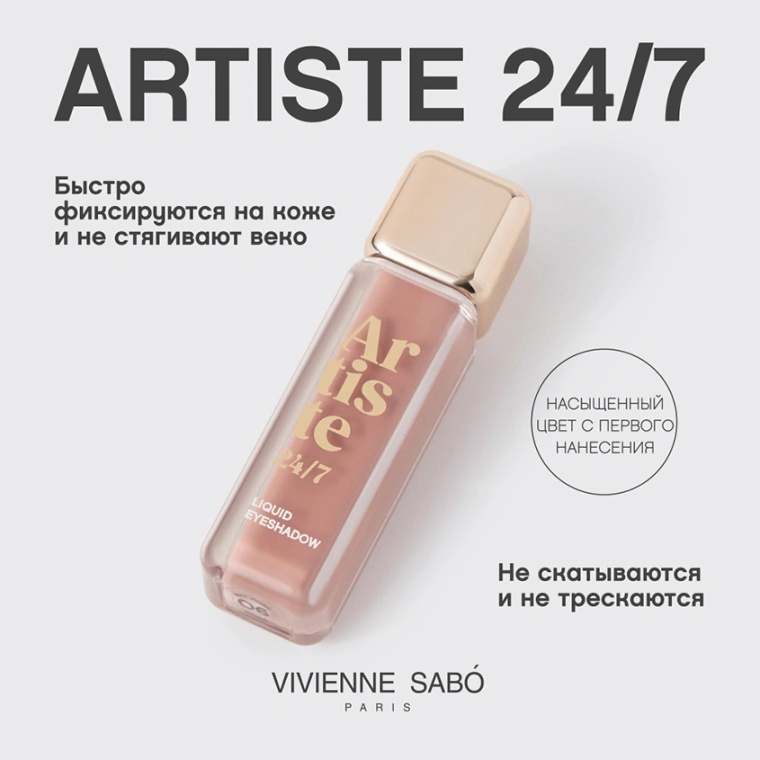 Стойкие жидкие тени ARTISTE 24/7 готовы сыграть как главные, так и второстепенные роли при создании любого образа. В коллекции шесть оттенков в тактильно приятном флаконе — три мерцающих шиммерных и три водостойких матовых. Тени быстро высыхают, не стягивают веко, не скатываются и не трескаются. Наноси сияющие оттенки на все подвижное веко или расставь ими игривые акценты. Матовые тона используй для ежедневного нюдового макияжа глаз или в качестве базы. И будь уверена — с тенями от VIVIENNE SABÓ твой образ невероятный 24/7.