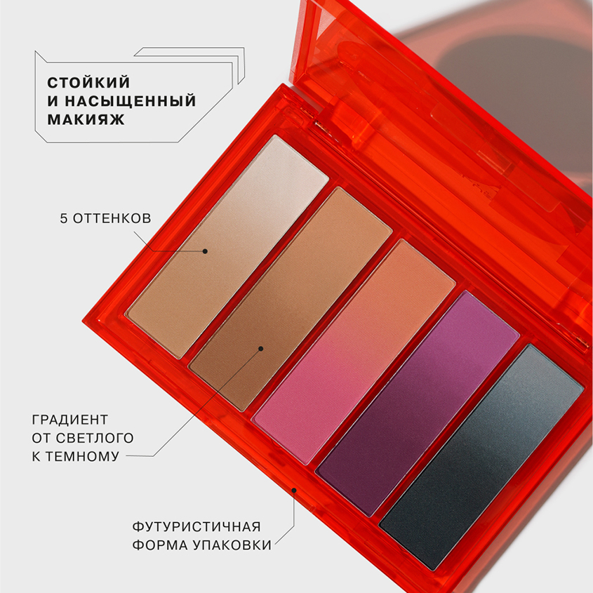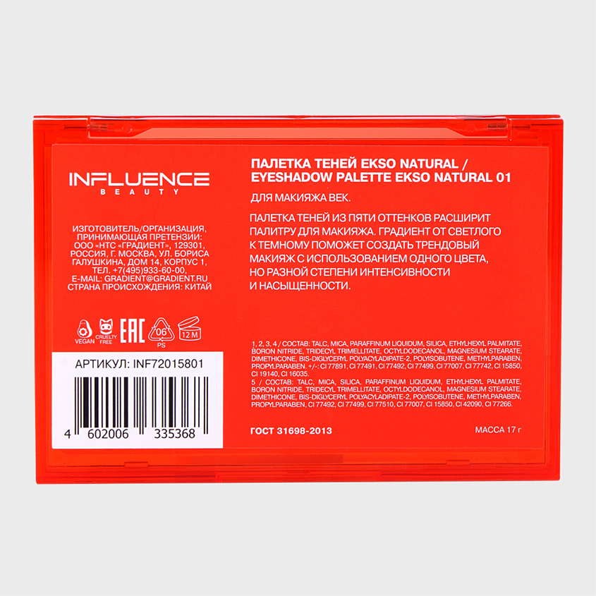 Палетка теней для глаз EKSO NATURAL от INFLUENCE BEAUTY - это 5 вертикальных годе с тенями, запрессованными градиентом, которые расширят палитру для макияжа глаз. Градиент от светлого к темному поможет создать трендовый макияж с использованием одного цвета, но разной степени светлоты и насыщенности. Цветовые сочетания соответствуют трендам на легкий матовый макияж глаз в нежных голубых, розовых, лиловых и натуральных телесных оттенках. Благодаря инновационной формуле PIGMENTAGENT с повышенным содержанием современных микропигментов в матовой палетке тени для век легко наносятся, отлично растушевываются, имеют насыщенную цветопередачу и стойко держатся на коже. Нет аналогов на российском рынке! В коллекции 1 палетка для глаз. Продукция не тестируется на животных и не содержит в своём составе компонентов животного происхождения. СПОСОБ ПРИМЕНЕНИЯ: Наносите тени для глаз кистью для теней или подушечками пальцев. Используйте 2-3 цвета в макияже для создания более выразительного эффекта. Нюдовые оттенки теней можно использовать как самостоятельный продукт, как основу под тени или как подложку для макияжа глаз. Яркие цвета теней можно использовать как подводку. Используйте также тени для стрелок, предварительно сбрызнув тени фиксатором макияжа от INFLUENCE BEAUTY.