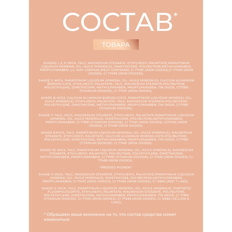 TALC, MICA, SILICA, PARAFFINUM LIQUIDUM (MINERAL OIL, HUILE MINERALE), BORON NITRIDE, ETHYLHEXYL PALMITATE, MAGNESIUM STEARATE, TRIDECYL TRIMELLITATE, OCTYLDODECANOL, DIMETHICONE, BIS-DIGLYCERYL POLYACYLADIPATE-2, POLYBUTENE, METHYLPARABEN, PROPYLPARABEN. [+/- MAY CONTAIN (PEUT CONTENIR): CI 77491 (IRON OXIDES), CI 77492 (IRON OXIDES), CI 77499 (IRON OXIDES), CI 77007 (ULTRAMARINES), CI 15850 (RED 6), CI 15850 (RED 7), CI 77266 (BLACK 2)].