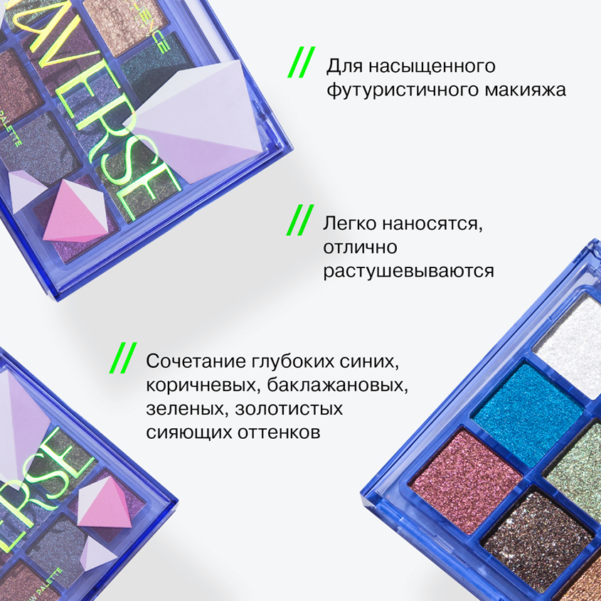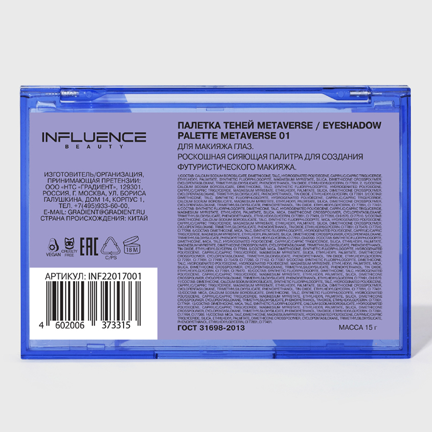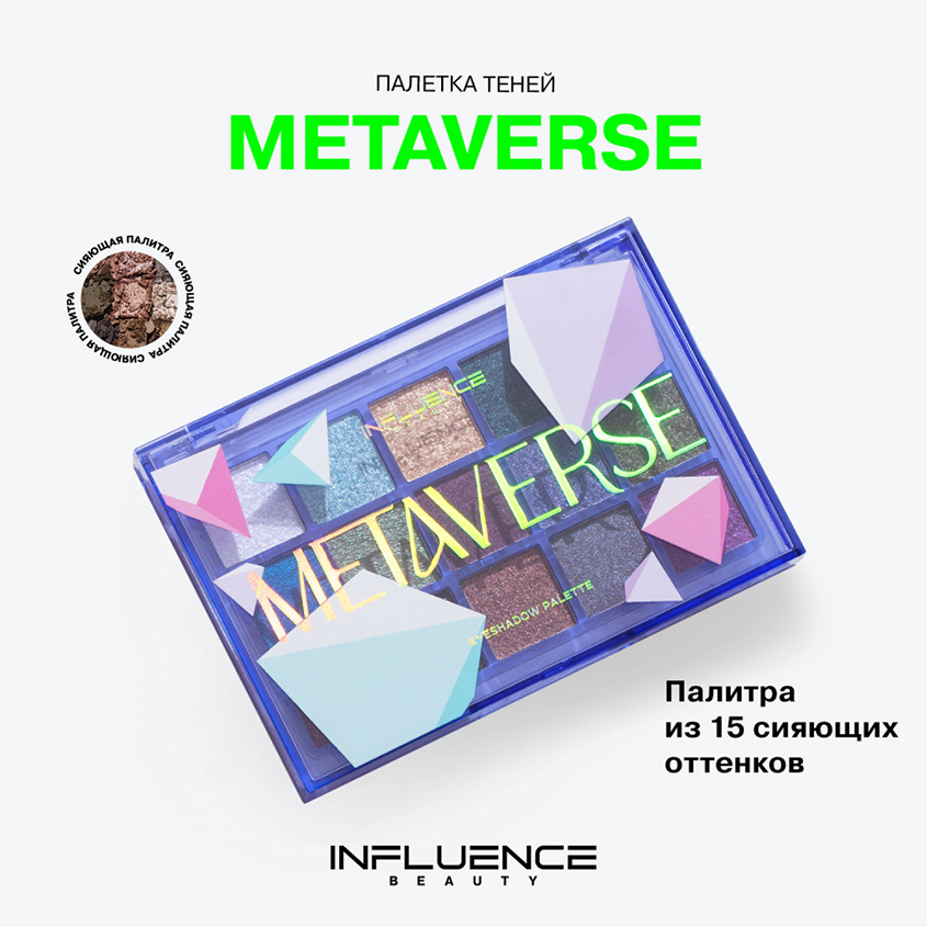 Палетка теней для глаз METAVERSE от INFLUENCE BEAUTY – роскошная палитра с глубокими синими, коричневыми и зелеными акцентами, которая идеально подойдет для создания любого образа: яркого, нюдового макияжа или smoky eyes. Палетка полностью состоит из глубоких дуохромных сияющих оттенков. Идеально подходит как для любителей, так и профессионалов. Благодаря инновационной формуле PIGMENTAGENT с повышенным содержанием современных пигментов тени для век легко наносятся, отлично растушевываются, имеют насыщенную цветопередачу и стойко держатся на коже. Комбинируйте яркие тени для глаз с натуральными - используйте разные цветовые комбинации в макияже глаз! В ассортименте 5 палеток для глаз. Продукция не тестируется на животных и не содержит в своём составе компонентов животного происхождения. СПОСОБ ПРИМЕНЕНИЯ: Наносите тени для глаз кистью для теней или подушечками пальцев. Используйте 2-3 цвета в макияже для создания более выразительного эффекта. Нюдовые оттенки теней можно использовать как самостоятельный продукт, как основу под тени или как подложку для макияжа глаз. Яркие цвета теней можно использовать как подводку. Используйте также тени для стрелок, предварительно сбрызнув тени фиксатором макияжа от INFLUENCE BEAUTY.