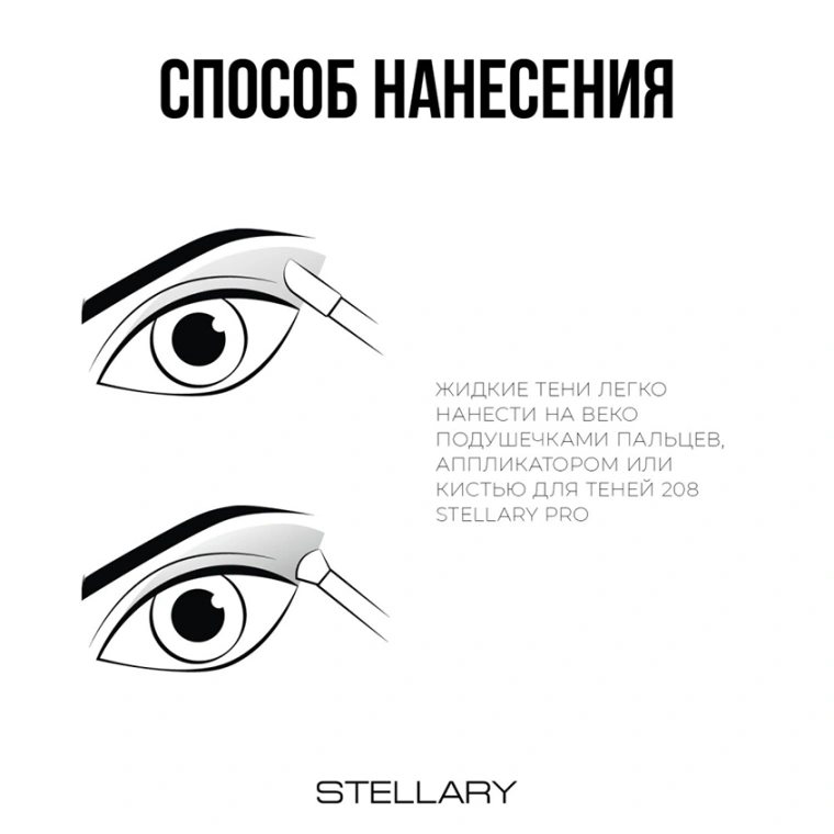 STELLARY PRO. После нанесения и растушевки дождитесь фиксации теней на веке. Время фиксации зависит от плотности нанесения теней. Благодаря невесомой текстуре тени можно использовать как базу для макияжа век. Интенсивность цвета можно регулировать количеством продукта — нанести и растушевывать в течение минуты до нужного эффекта.
