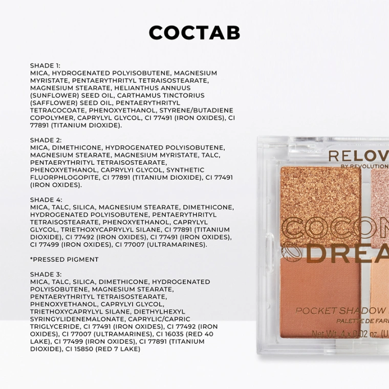 MICA, TALC, DIMETHICONE, HYDROGENATED POLYISOBUTENE, PENTAERYTHRITYL TETRAISOSTEARATE, MAGNESIUM STEARATE, MAGNESIUM MYRISTATE, PHENOXYETHANOL, CAPRYLYL GLYCOL, CI 77891 (TITANIUM DIOXIDE), CI 77492 (IRON OXIDES), CI 77491 (IRON OXIDES), CI 77499 (IRON OXIDES).